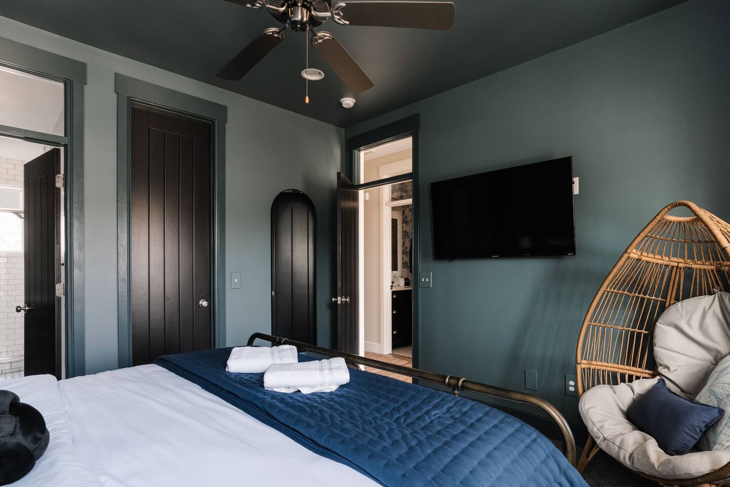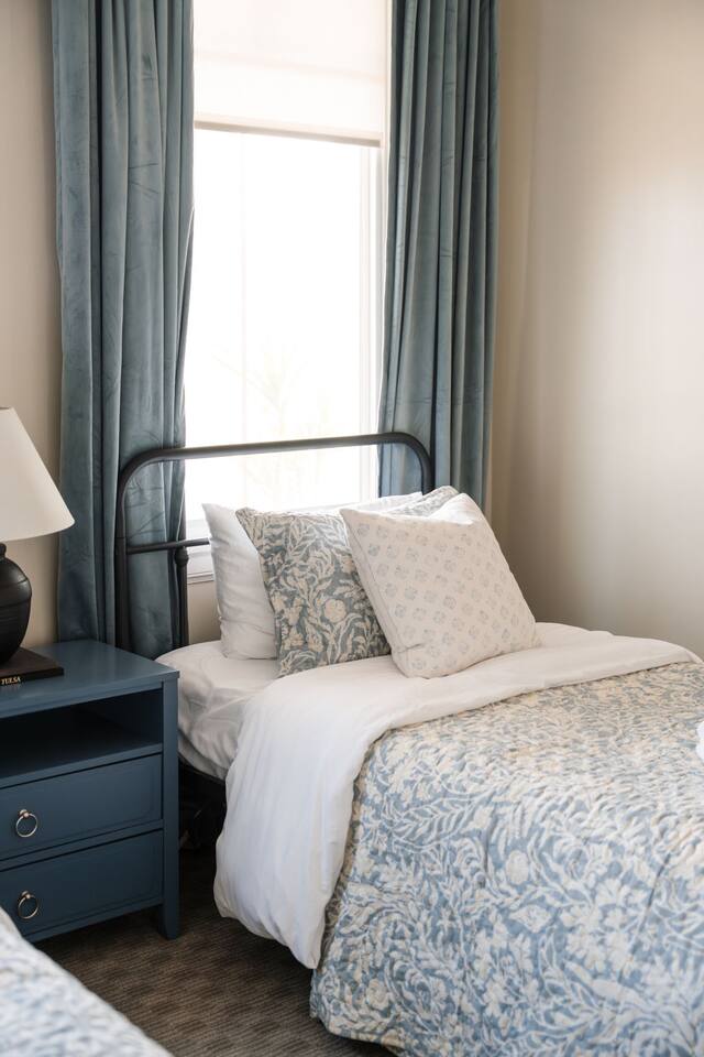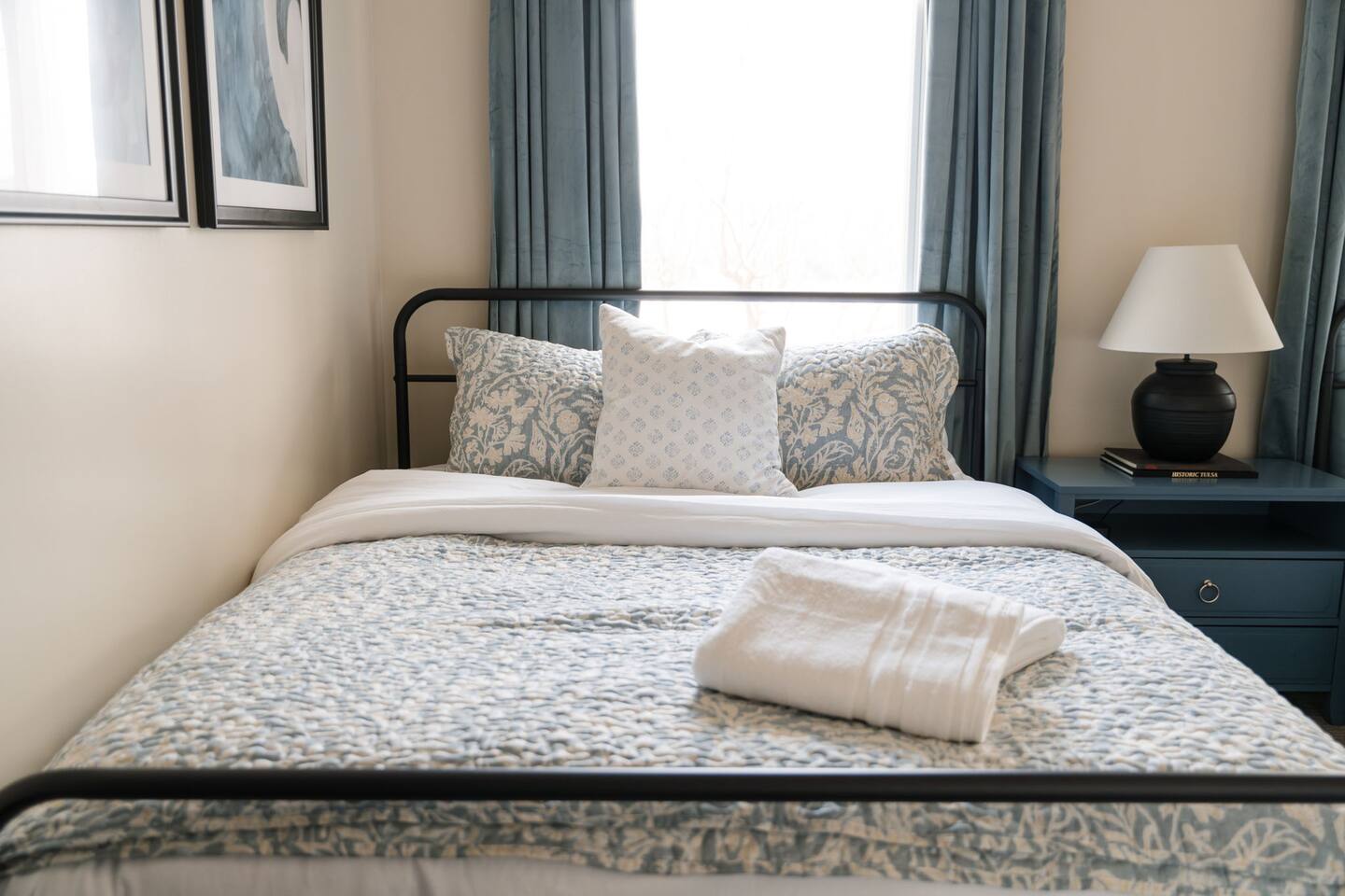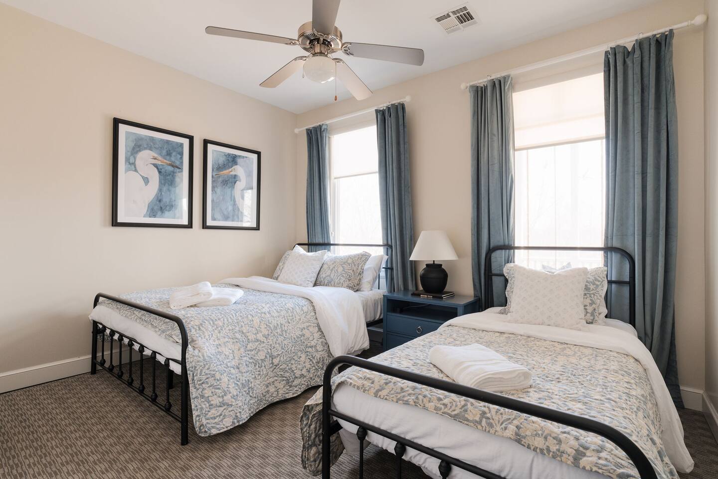 Primary Suite: The large primary bedroom has a king bed, TV on the wall, ceiling fan, bedside table fan, sound machine and room-darkening curtains. There's an en-suite bathroom with a shower and 2 sinks. There's also a closet off the bedroom that includes a pack-n-play (but you'll need to bring your own pack-n-play sheet), a safe, and a dresser. Second Bedroom: This bedroom includes a queen bed plus a twin bed, a ceiling fan, bedside table fan, sound machine, and room-darkening curtains . There's an attached closet that has a dresser inside as well as toys and books for little ones. The second bathroom is off the hallway, but also connects to the second bedroom by a pocket door. Living room Sofa Bed: The blue sofa is a memory foam queen pull out bed. Accessibility Note: Our home is not ADA compliant. However, it may be a good option for guests with limited mobility since it is a single-level unit with no stairs between our parking spot and the front door. Please note: there is a small threshold step at the entry and a threshold step to enter the primary suite shower.